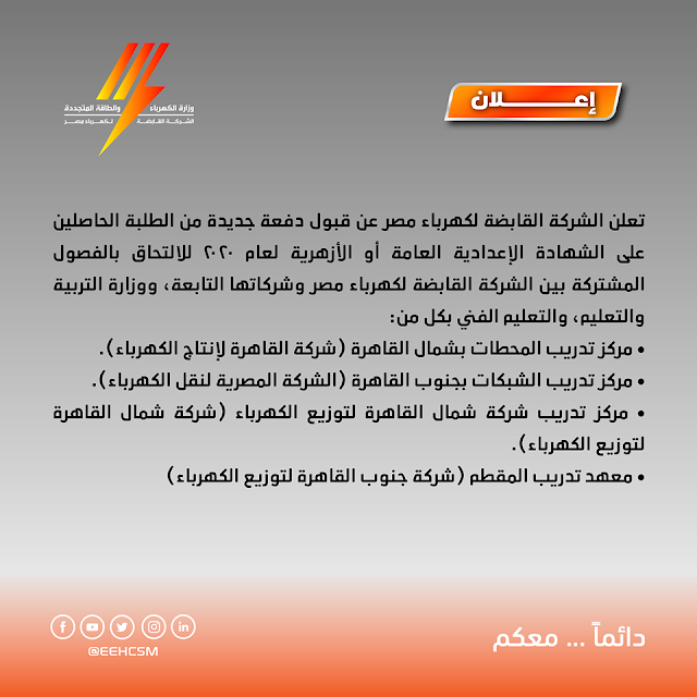 حيث أشارت الشركة القابضة لكهرباء مصر عن بدء قبول دفعة جديدة من الطلبة الذين حصلوا علي الشهادة الاعدادية العامة او الشادة الإعدادية الازهرية للعام الدراسى 2020 و ذلك من أجل الالتحاق بالفصول المشتركة بين الشركة القابضة لكهرباء مصر وشركاتها التابعة وزارة التربية والتعليم