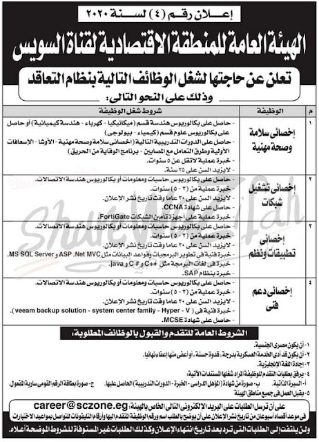 أعلنت الهيئة العامة للمنطقة الاقتصادية لقناة السويس عن طرح وظائف جديدة و سيتم التعيين الوظفين الجدد على نظام التعاقد هذا و قد تم الاعلان رسميا عن وظائف الهيئة العامة للمنطقة الاقتصادية لقناة السويس من خلال منشور رمى صدر بتاريخ 29 نوفمبر لعام 2020 و قد حمل الاعلان رقم 4 لسنة 2020 و إليكم كافة التفاصيل التى وردت في إعلا وائف قناة السويس .